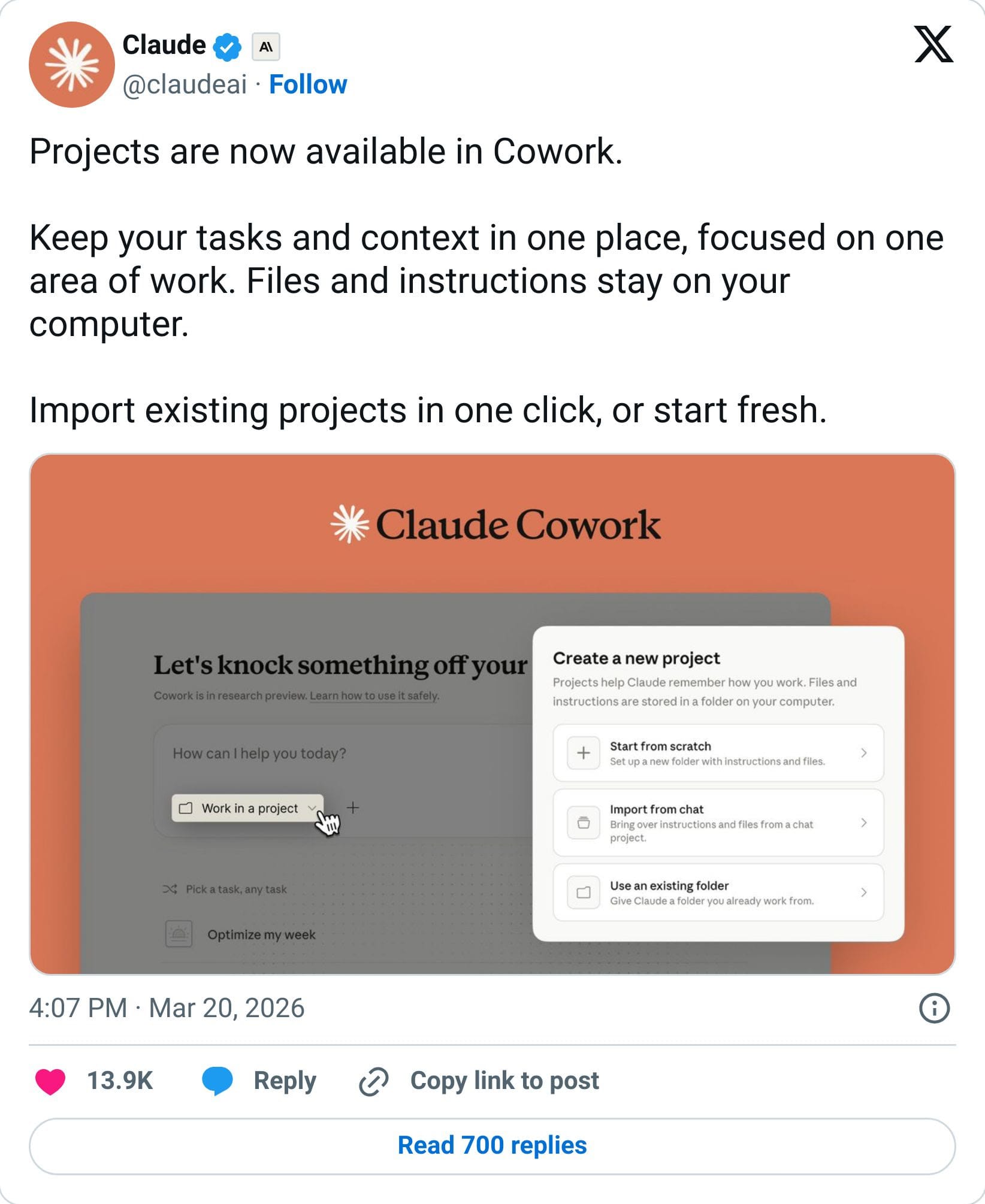 Anthropic rolled out Projects in its Claude Cowork, allowing users to import their existing web-based Claude projects or create them to use on the desktop app.